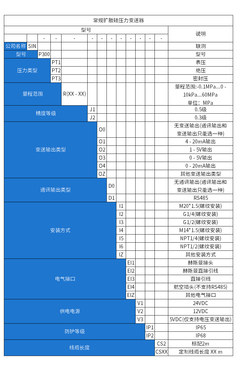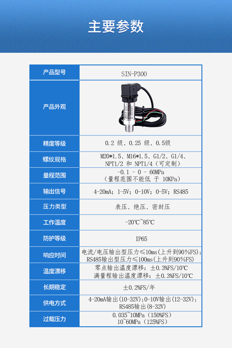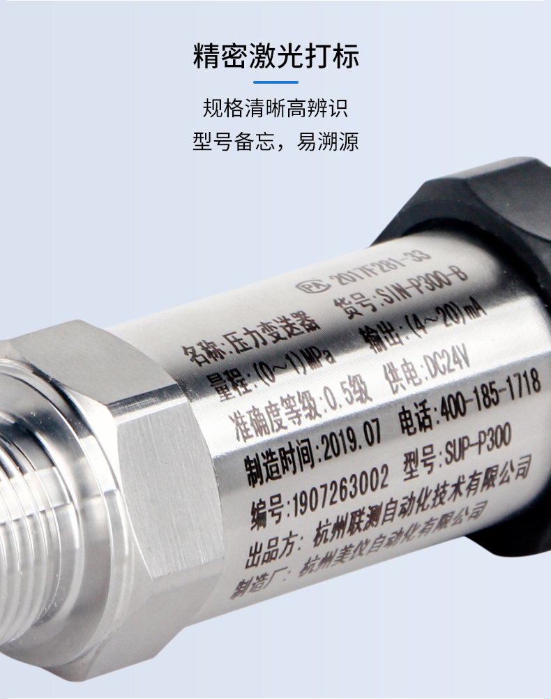 SIN-P300通用型壓力變送器德國進(jìn)口硅芯片,精度高性能穩(wěn)定;SIN-P300型通用型壓力變送器采用擴(kuò)散硅壓力芯體作為敏感元件,內(nèi)置處理電路將傳感器毫伏信號(hào)轉(zhuǎn)換成標(biāo)準(zhǔn)電壓﹑電流信號(hào)輸出,可直接與計(jì)算機(jī)、控制儀表﹑顯示儀表等相連。選用高穩(wěn)定性和高可靠性的壓阻式壓力傳感器和高性能的變送器專用電路,整體性能穩(wěn)定可靠,可進(jìn)行遠(yuǎn)距離信號(hào)傳輸。采用一體化全不銹鋼結(jié)構(gòu),經(jīng)過多次不銹鋼焊接,實(shí)現(xiàn)了全固態(tài)設(shè)計(jì),安裝方便,具有高抗振性和抗沖擊性,在惡劣環(huán)境中可以長期使用。廣泛應(yīng)用于工業(yè)自動(dòng)化設(shè)備配套以及石油、化工、冶金、電力等控制領(lǐng)域。